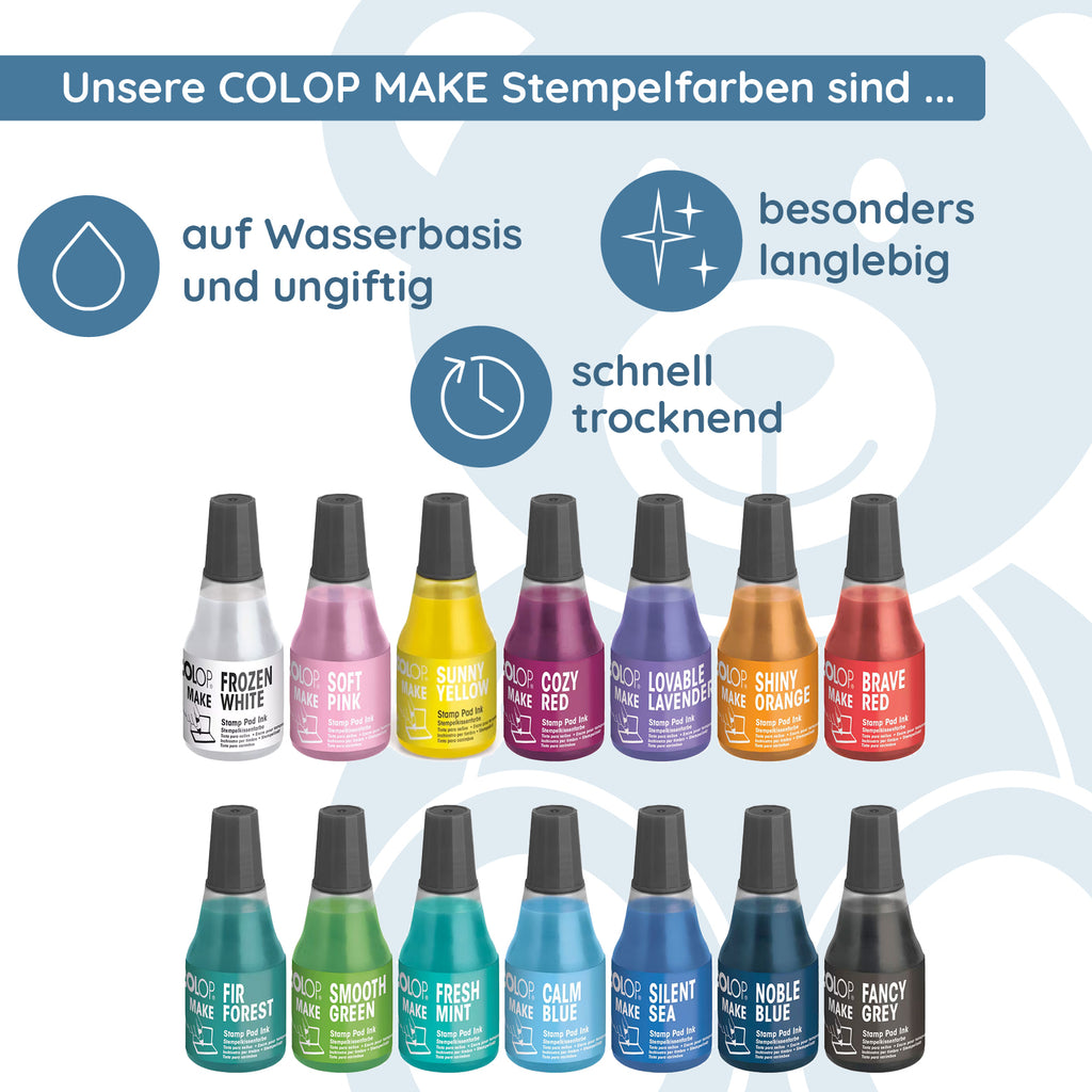Entdecken Sie die optimale Lösung zur Verlängerung der Lebensdauer Ihrer Colop MAKE Stempelkissen mit unseren passenden Nachtränkfläschchen. Diese speziele Nachfülltinte sorgt dafür, dass Ihre Stempelkissen stets gleichmäßig und satt mit Farbe versorgt sind, wodurch jeder Stempelabdruck klar und präzise bleibt.