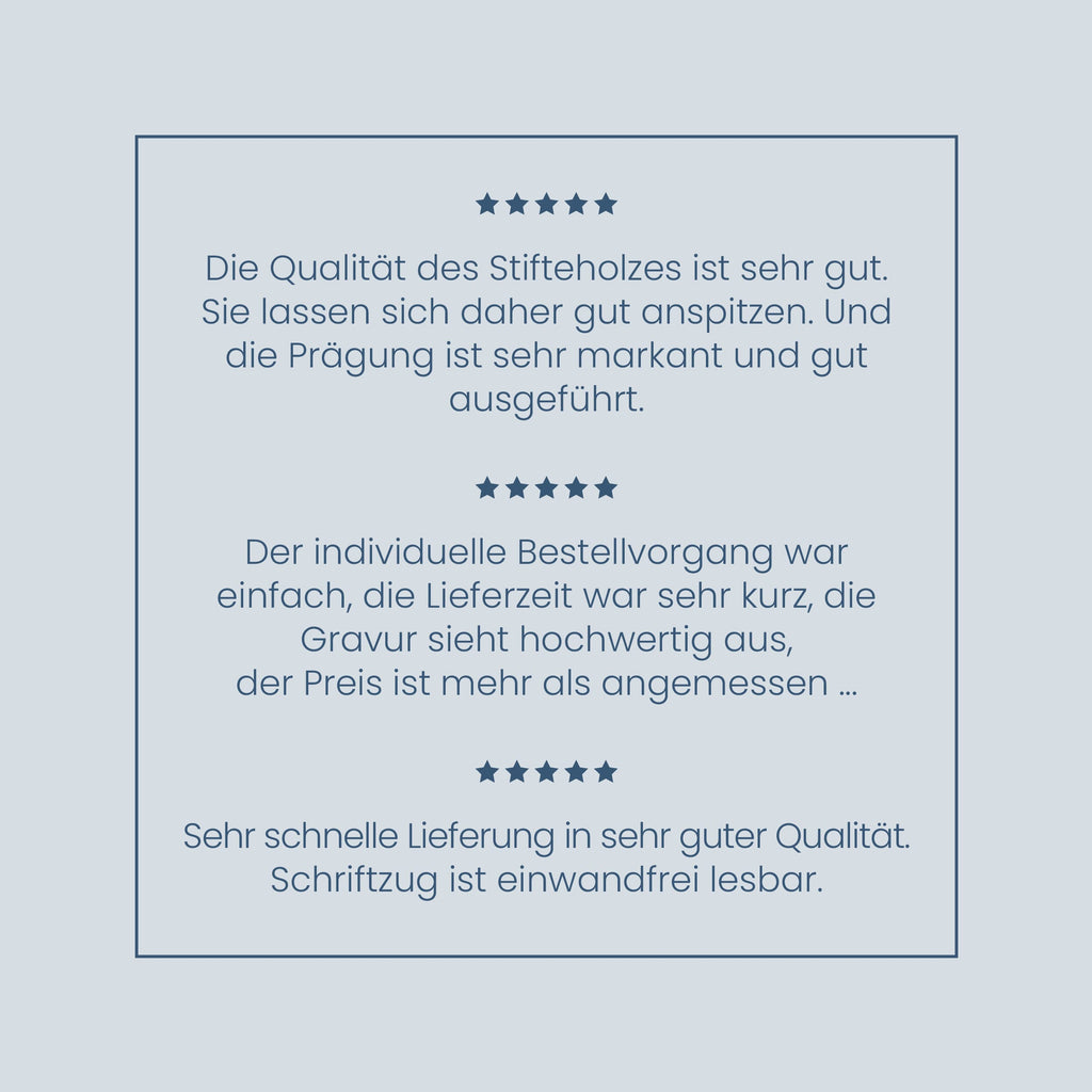 Gefertigt als Naturprodukt, überzeugen die Bleistifte durch ihre angenehme Haptik und klassische Optik. Durch die individuelle Lasergravur mit Ihrem Wunschtext werden sie zu einem praktischen Werbeträger oder einem persönlichen Accessoire mit Wiedererkennungswert.