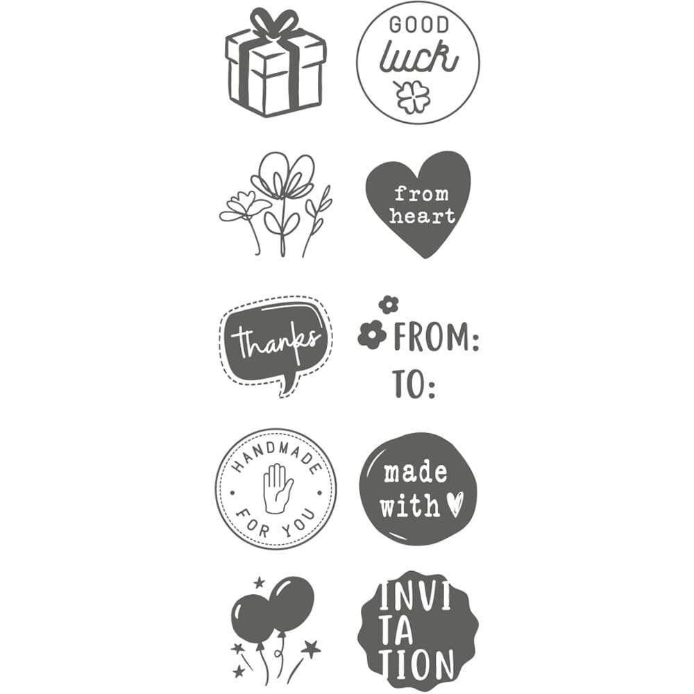 Mit diesem Stempelset können Sie Einladungen, Dankeskarten und jede andere kreative Bastelarbeit erstellen.