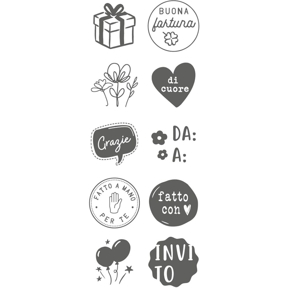 In diesem Set sind 10 verschiedene Stempelplatten enthalten, die zum Thema Italienisch passen, einfach austauschen