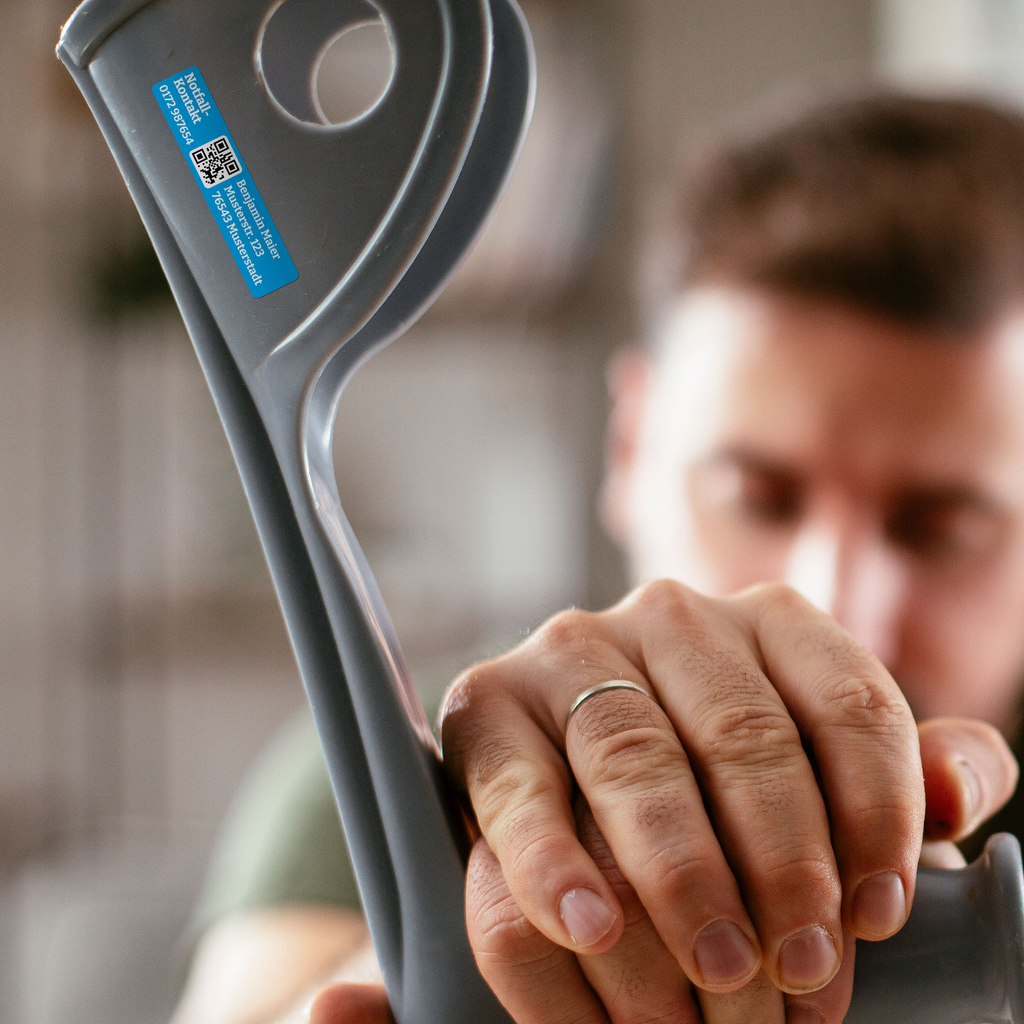 Die Aufkleber enthalten deinen Namen, Telefonnummer und Adresse im Klartext sowie zusätzlich als QR-Code, sodass Helfer, Finder oder Kunden dich sofort kontaktieren können.