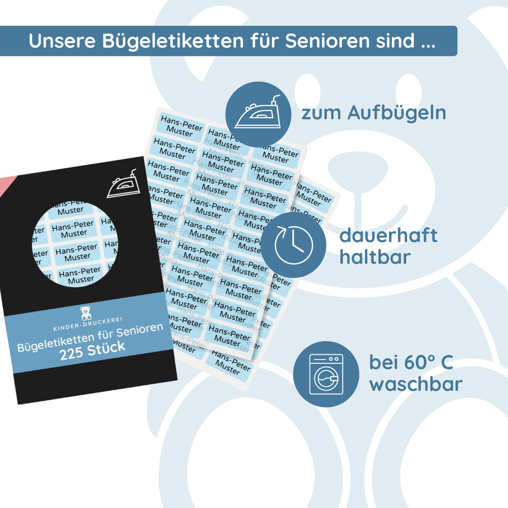 Nos 225 étiquettes thermocollantes pour seniors (30x13 mm) sont la solution idéale pour l'identification durable des vêtements dans les maisons de retraite et établissements de soins. Grâce au matériau de haute qualité et durable et à l'application facile par thermocollage, chaque étiquette thermocollante pour seniors reste solidement fixée même après de nombreux lavages.
