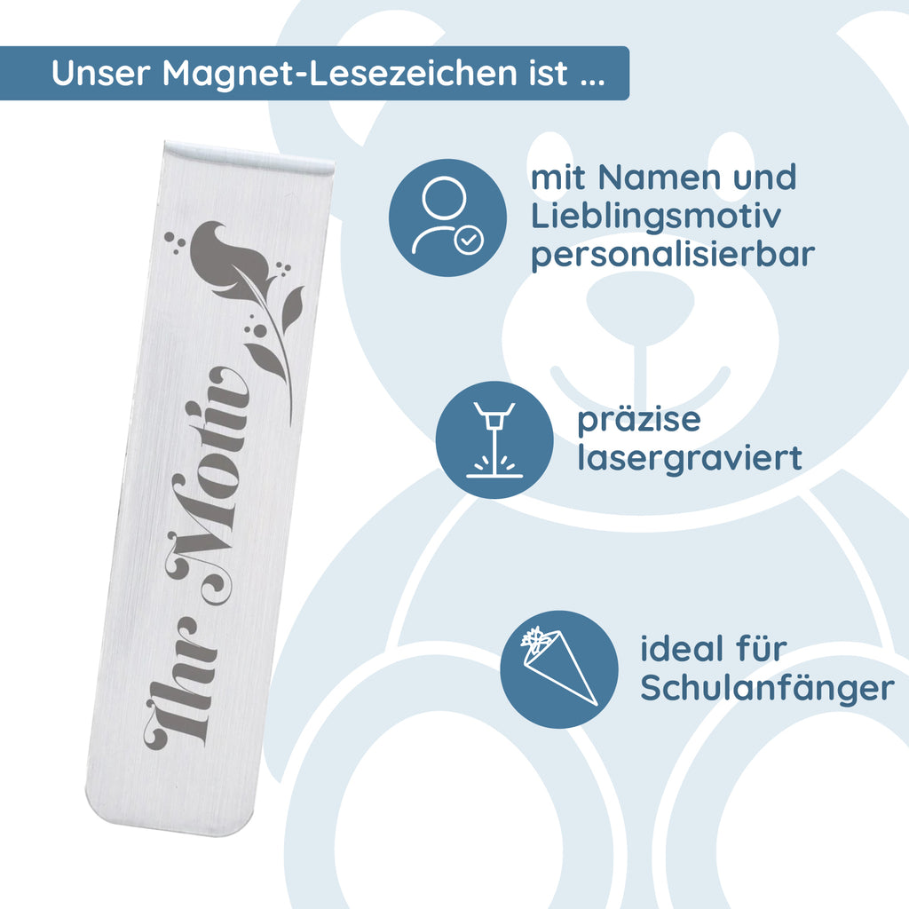 Avec une gravure individuelle de haute qualité, le signet magnétique devient personnalisé et se transforme en un accessoire unique ou en un cadeau spécial pour les amoureux des livres, les lecteurs passionnés et tous ceux qui apprécient les détails élégants. Que ce soit avec un nom, une citation inspirante ou votre logo – créez votre signet magnétique personnalisé exactement selon vos souhaits.