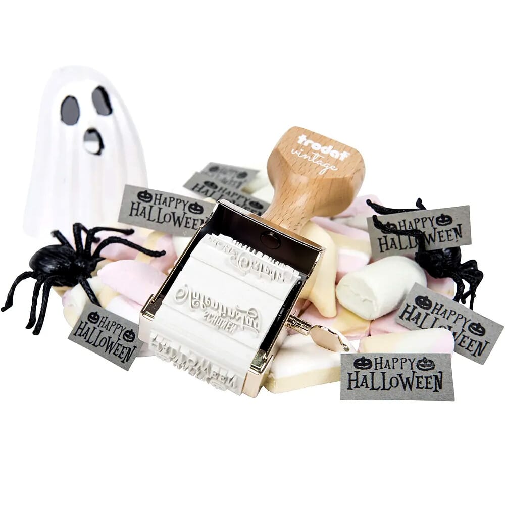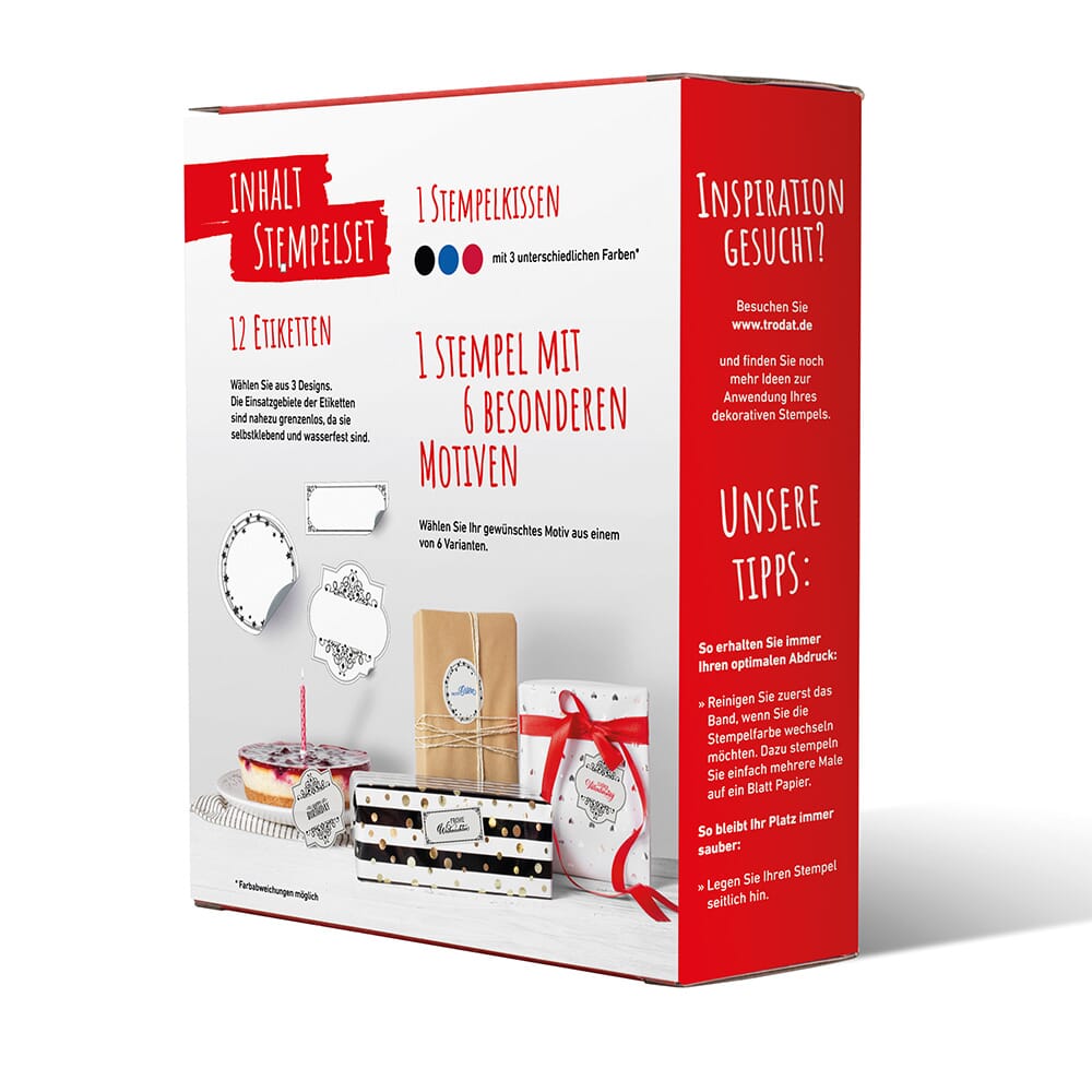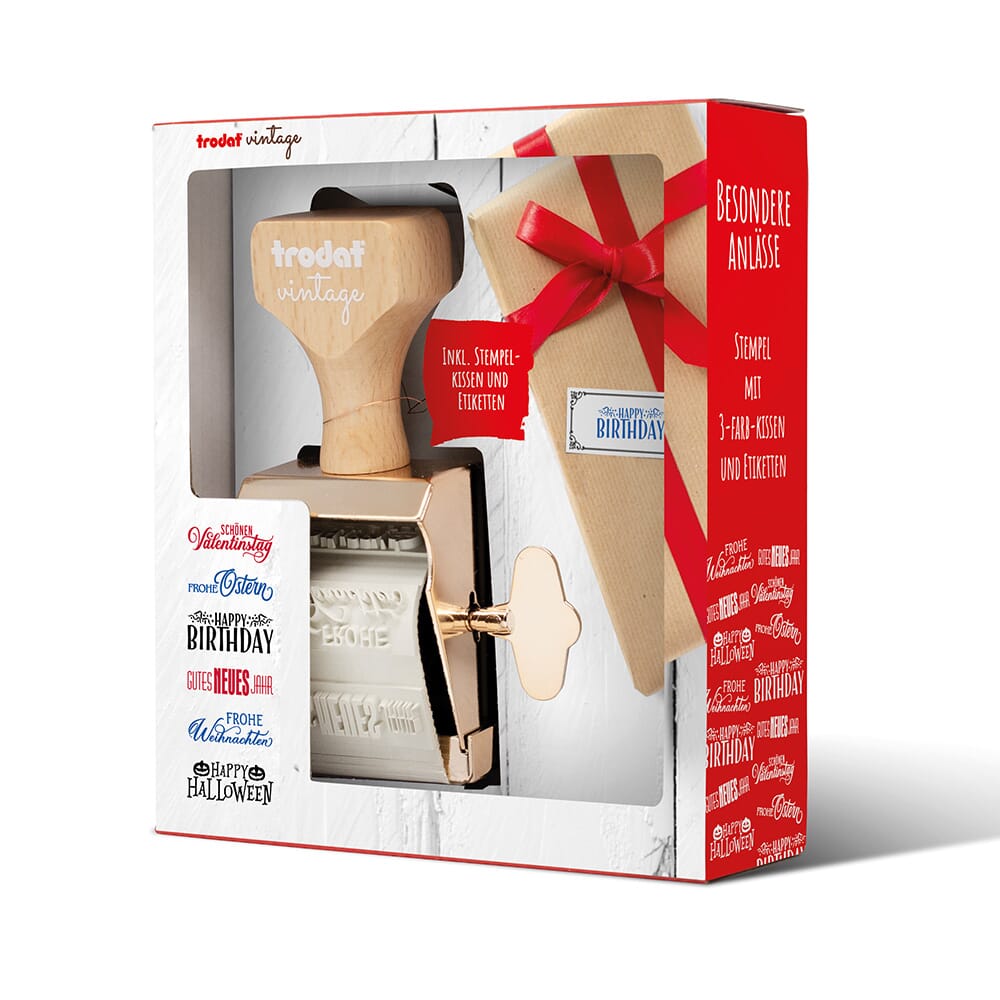 Tampon vintage Trodat avec 6 motifs spéciaux sur le thème des occasions spéciales, incluant 1 tampon encreur manuel avec 3 couleurs (noir, rouge carmin et bleu) et 12 étiquettes adaptées à l'occasion.