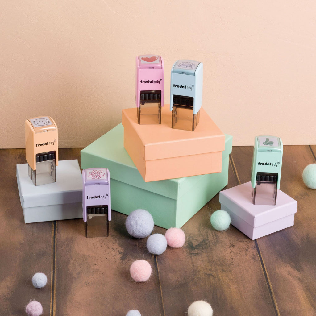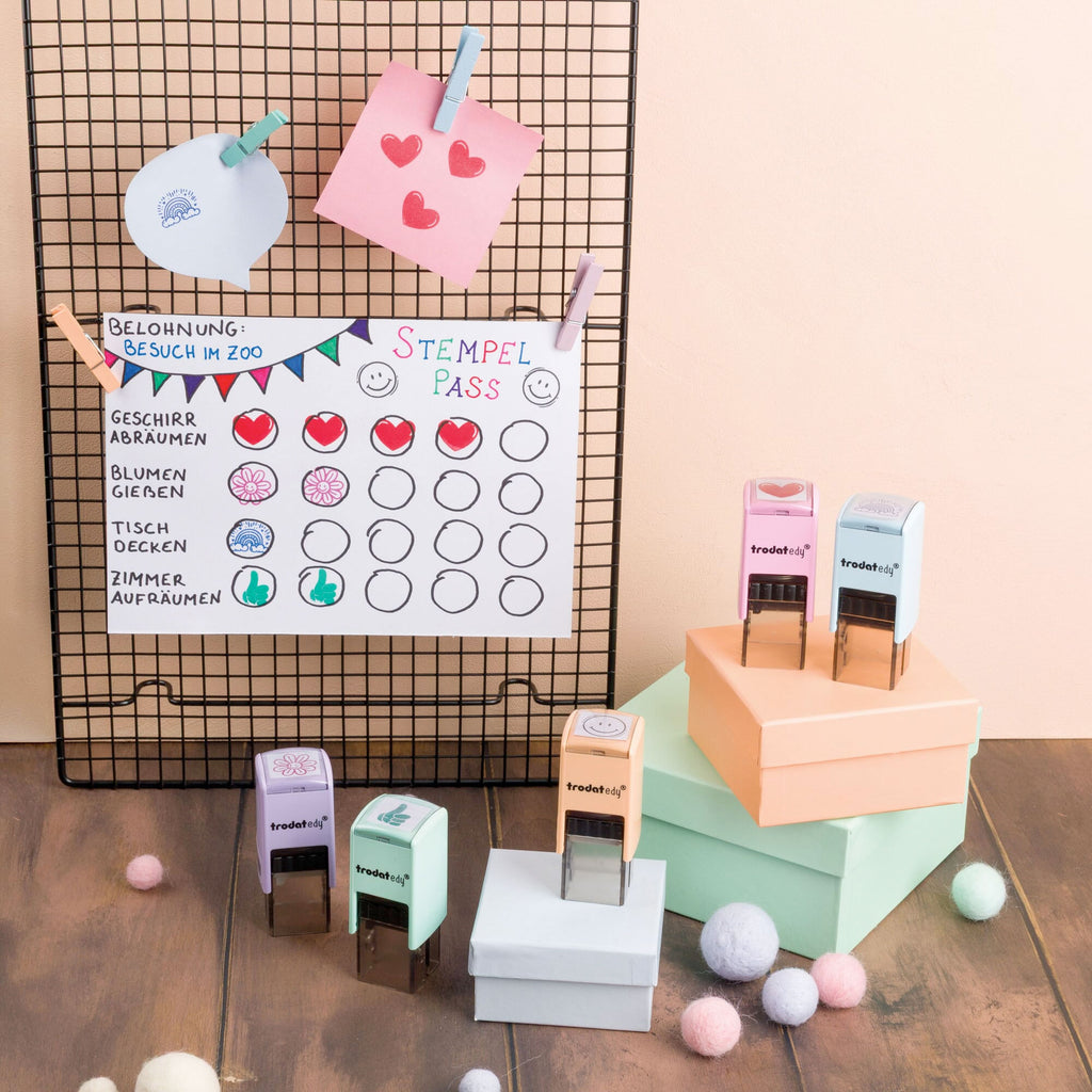 The Trodat edy® motivational stamps are the perfect choice to show your appreciation and recognition in a creative way. With fifteen different housing colors and fifteen unique motifs – flower, thumbs up, heart, smiley, rainbow, star, fairy, princess, unicorn, butterfly, brontosaurus, plesiosaurus, stegosaurus, T-Rex and triceratops – these stamps offer countless ways to leave small messages.